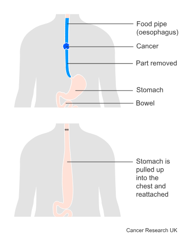 The procedure involved removing two thirds of the original oesophagus and part of my stomach impacted by the cancer, and all lymph nodes. The stomach is then stretched up to form the new oesophagus. The whole procedure used a robot assisted and through keyhole. I have a number of holes across my abdomen, and drain holes down my side, and a large incision in the back of the chest to remove the impacted organs.